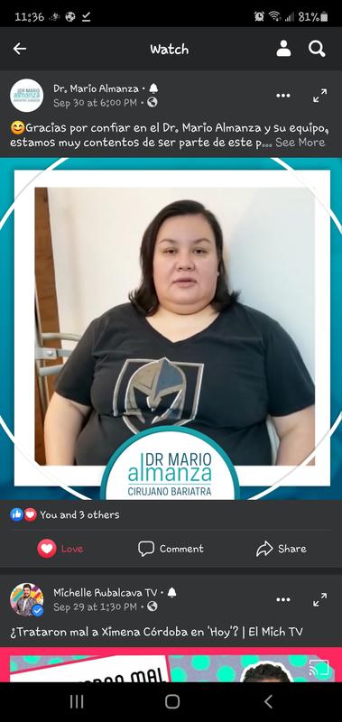 Hola, yo tuve una cirugia de Manga Gastrica con el Dr. Mario Almanza... el dia 9 de Julio del 2020... mi experiencia fue muy buena desde el momento que pasaron por mi al Aeropuerto sent mucha seguridad... luego nos llevaron a realizarnos una tomograf a de pulmon para descartar el Covid 19... lo cual me dio mucha tranquilidad de saber que todas las personas que est bamos en el hospital no ten amos Covid... posteriormente fuimos al Hospital donde nos recibi un muy amable Staff... me realizaron las pruebas preoperatorias... de Ah nos llevaron al Hotel donde ya ten amos reservaciones... la mañana siguiente pasaron por nosotros a las 6 am para ir a nuestra cirug a al hospital... Conocimos al Dr Almanza... nos dio una breve explicaci n del procedimiento... nos pregunto como nos sentiamos... y entramos a cirug a... las primeras 24 hrs son de un poco de dolor e inconformidad, pero pasando esas 24 hrs te sientes mucho mejor... El Dr. Marcelo esta muy al pendiente de todos los pacientes... la atenci n de las enfermeras es muy buena... Solo recuerdo algunos nombres... me gustar a recordar todos para hacerles el reconocimiento... pero la verdad que TODOS son muy atentos y est n muy al pendiente si necesitas algo... los dias transcurrieron tranquilos con una muy buena atenci n por parte de los M dicos y l@s enfermer@s... pasados los 3 d as ya me sent a muy bien y fuerte... y nos llevaron temprano al Aeropuerto... y la Aventura termino... hoy estoy a casi 4 meses de mi cirugia y estos son mis n meros